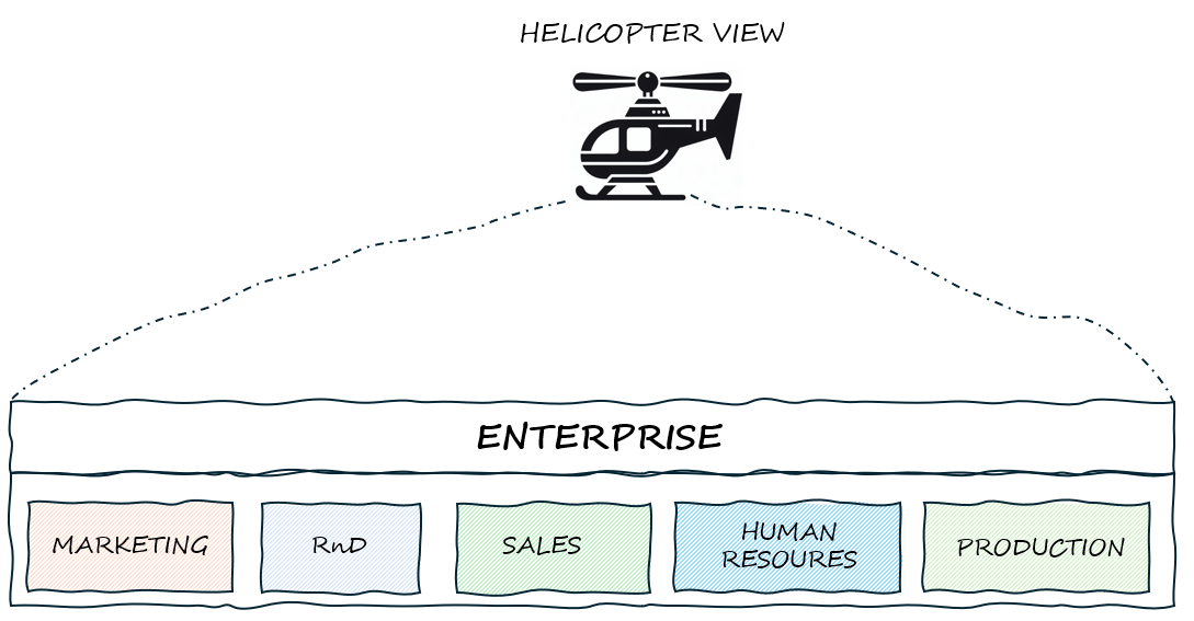 A frequently heard term among executives during planning is "helicopter view." Essentially, this means adopting a wide-ranging perspective of the entire company, akin to observing from a helicopter's altitude.